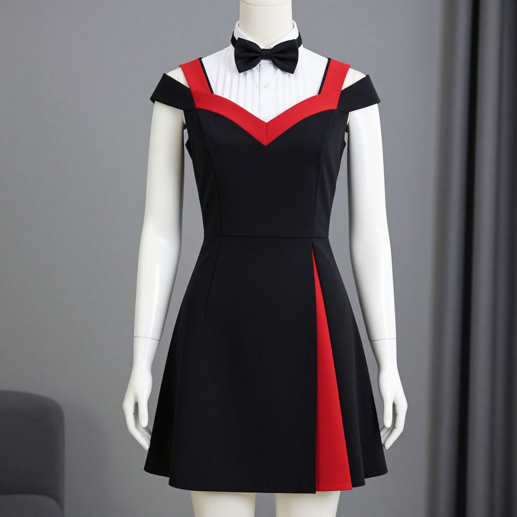 A mannequin wearing a black dress with red accents and a black bow tie, standing in a stylish, minimalist setting with a focus on the intricate details of the clothing and the mannequin's elegant posture. The mannequin's design is highly detailed, with a sleek, modern aesthetic that highlights the contrast between the black dress and the red accents, while the black bow tie adds a touch of sophistication and elegance. The scene is lit with soft, even lighting to emphasize the textures and colors of the clothing, creating a visually striking and professional image.