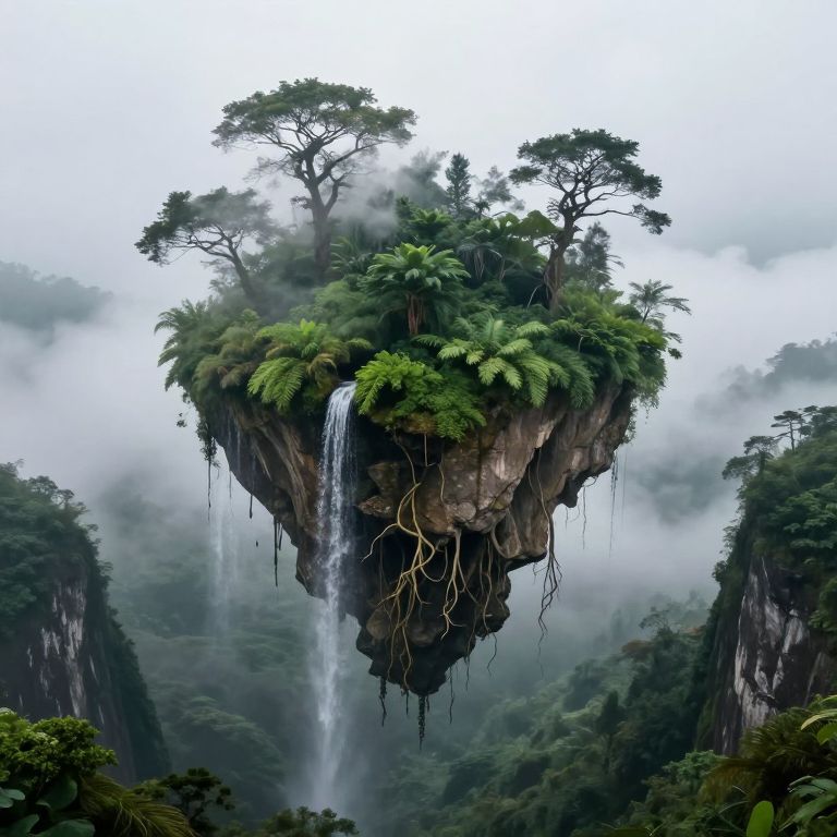 Photograph of a surreal floating island in a misty, dense forest. The island, resembling a large rock, is covered in lush green ferns, trees, and a cascading waterfall that drips down its sides. Tall, thin trees with sparse canopies top the island, while thick fog envelops the background, enhancing the mystical atmosphere. Surrounding cliffs and dense forest vegetation frame the scene, creating a sense of isolation and enchantment. The image is rich in contrasting textures: the rugged rock, soft greenery, and misty ambiance.