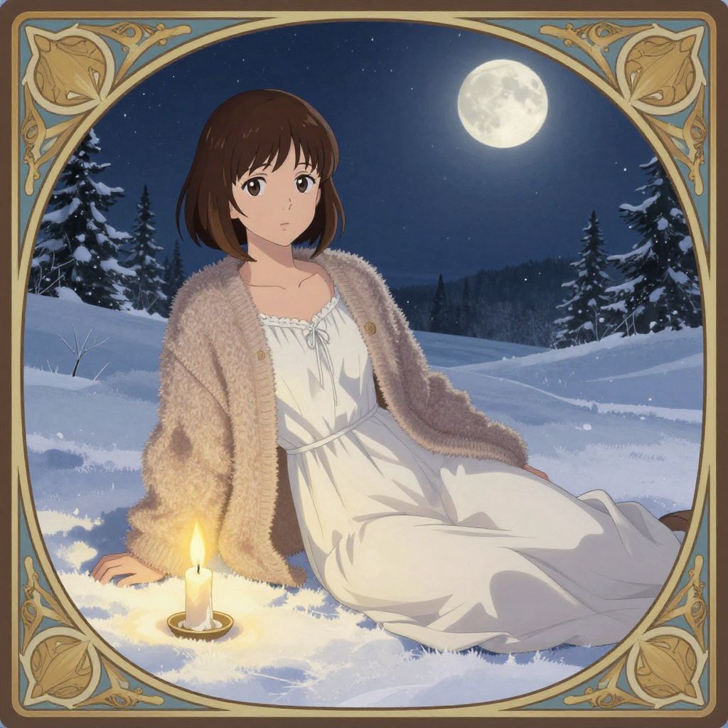 Anime-style illustration of a young woman with a brown bob haircut and gentle expression. She is wearing a soft cashmere cardigan over a flowing white dress, lying in a snowy landscape under moonlight. A lit candle in front of her casts a warm light, and the scene is framed with ornate Art Nouveau decoration.