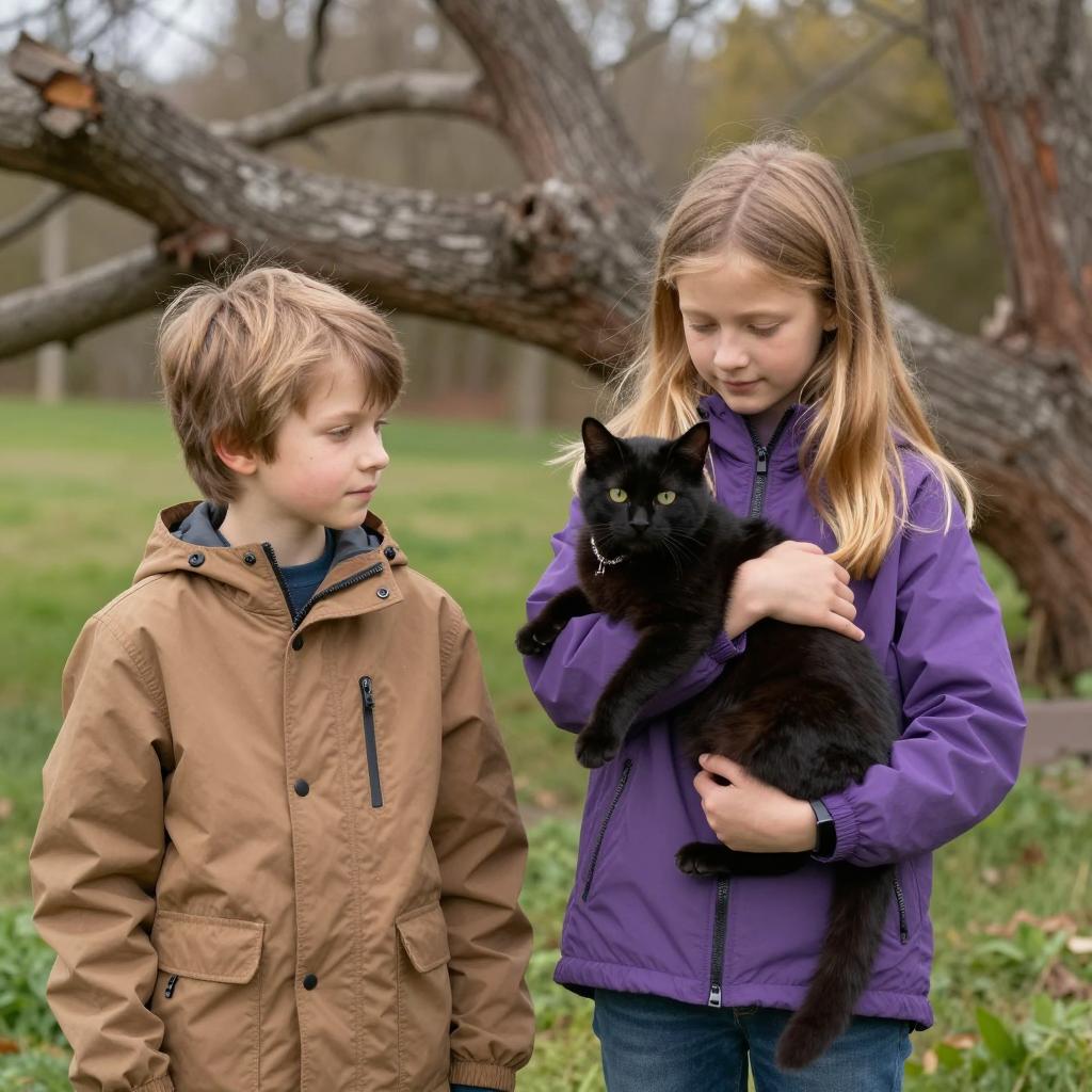 Two people in a wooden pen with hay. Center sheep with curly wool, horns, and focused gaze. Left person with short dark hair, red jacket, and hands on pen. Right person with curly dark hair, green jacket, and arms on pen. Overcast sky in background. Wooden pen with blue roof. Sheep's head in middle. People on left and right.