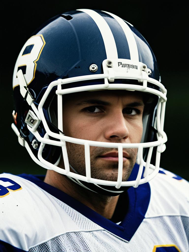 Man in Football Jersey Costume, close-up dramatic headshot with helmet