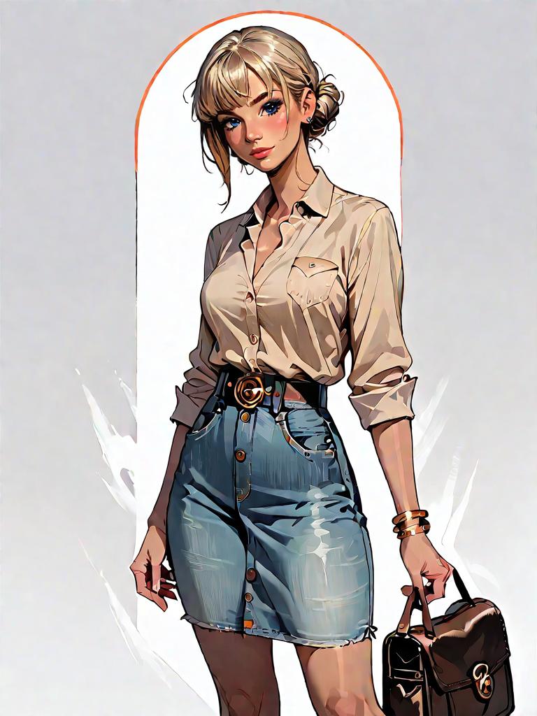 1girl, source_comics, realistic face, full body shot, Woman, casual, denim shirt dress in a medium wash, long sleeves with buttoned tabs for rolling up, knee-length, two chest pockets with button flaps, tan leather shoulder bag with fringe detail, slim leather belt at the waist, chunky gold cuff bracelet.