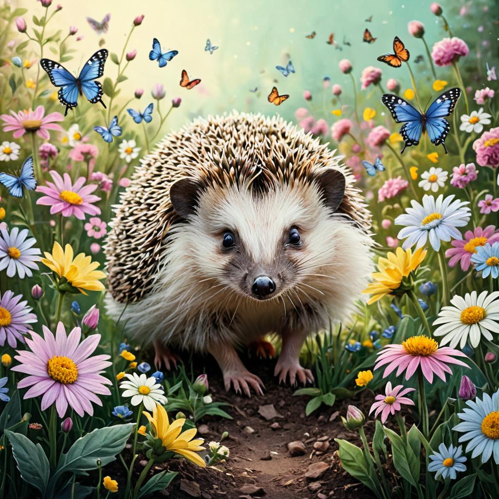 Charming pastel illustration of a hedgehog in a flower garden, surrounded by butterflies and blooming flowers, whimsical and gentle ambiance.
