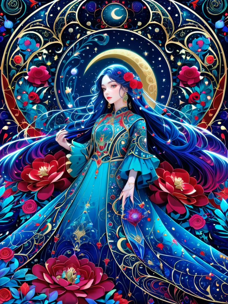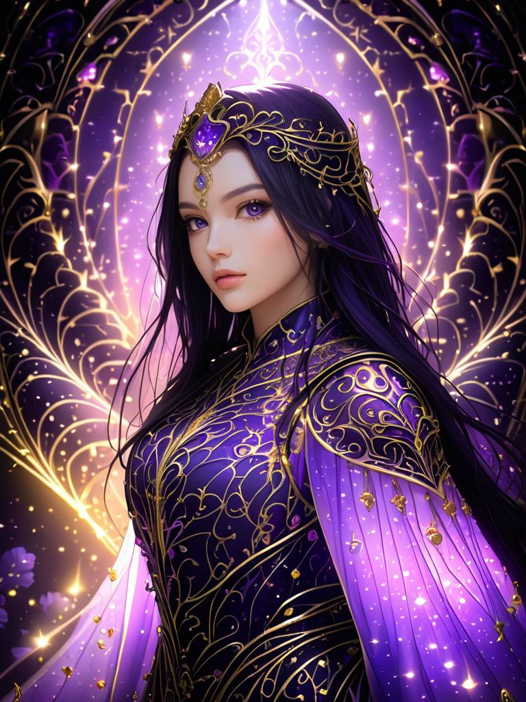 A glamorous fantasy portrait of a woman with long flowing dark hair, wearing ornate fantasy armor with glowing accents and vibrant purple and gold colors, standing in a softly lit ethereal environment with bluish and warm glowing bokeh lights in the background, highly detailed, mystical and enchanting mood