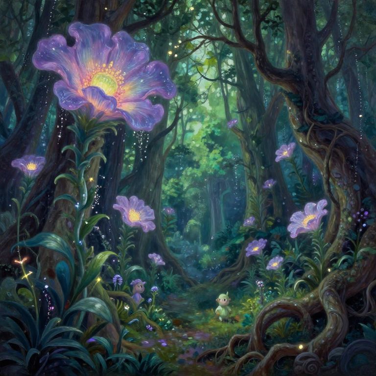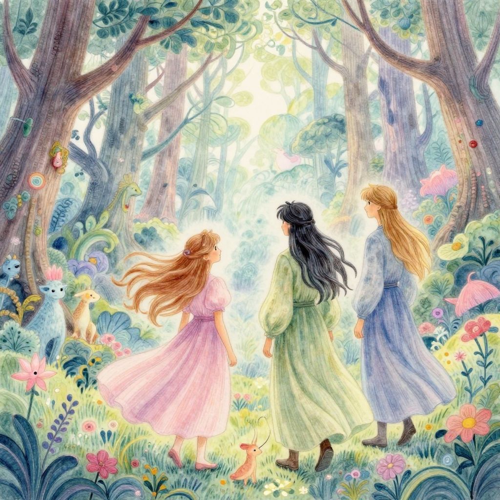 Hand drawn characters exploring a mystical forest, intricate details, pastel color palette, flowing hair and clothes, magical creatures, enchanted environment, dreamy and ethereal vibe