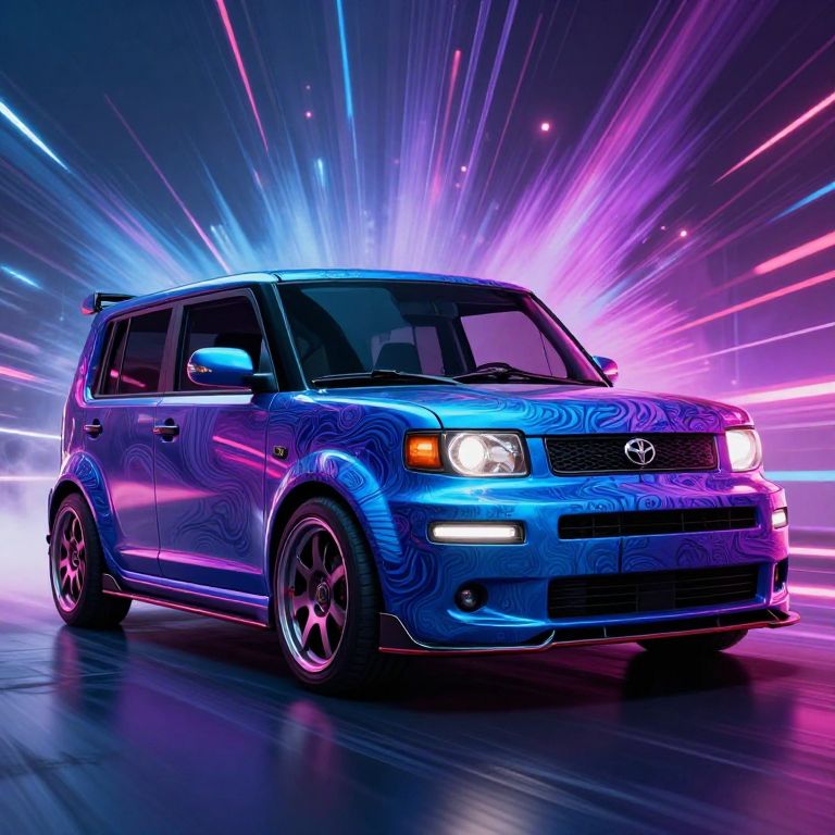The image showcases a highly detailed and photorealistic rendering of a 2005 Scion xB, set against a dynamic, cyberpunk-inspired background. The car is positioned in a low camera view, emphasizing its sleek, futuristic design. The vehicle features intricate, swirling patterns and a vibrant color palette dominated by shades of blue, purple, and pink, giving it a cool, almost evil tuning aesthetic. The car's headlights and grille are prominently displayed, while its wheels are adorned with detailed, metallic rims. The background is a burst of light and energy, with streaks of light radiating outward, creating a sense of motion and intensity. The overall composition is highly dynamic, with the car and background elements interacting in a visually striking manner, capturing the essence of a high-rendering, 32K, UHDD image.