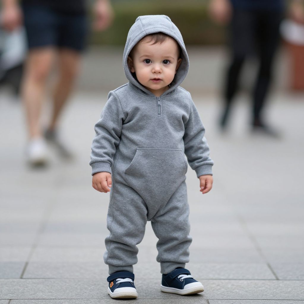 Baby stroller costume, hood, male focus, 1boy, blurry background, shoes, blurry, outdoors, hoodie, hood up, full body, looking at viewer, pants, sneakers, standing, solo focus, long sleeves, solo, short hair