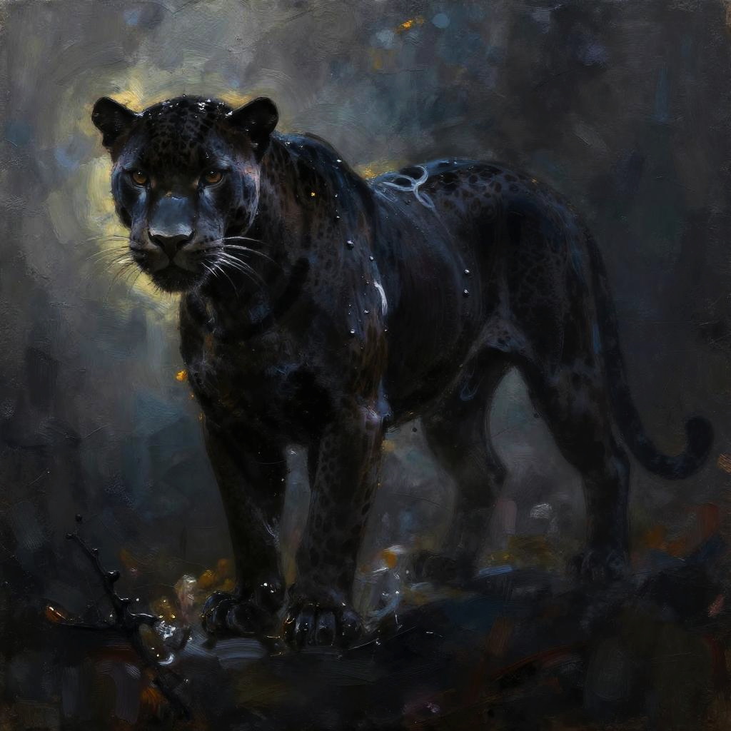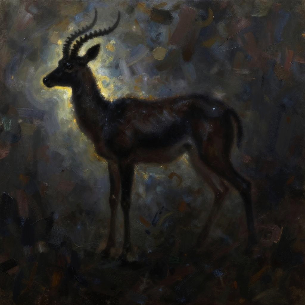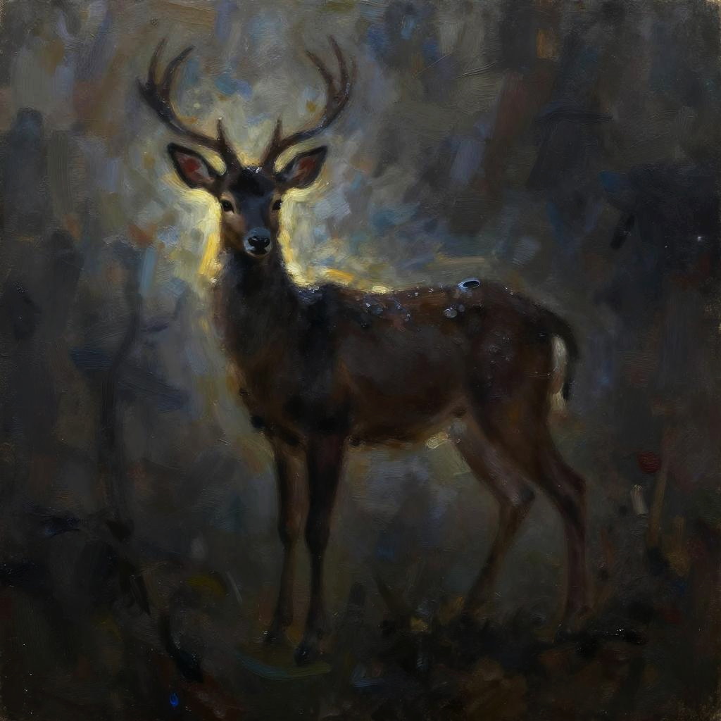 Painterly, shadow play, a majestic stag as a silhouette in darkness, slender body covered in oily substance, rim light, mysterious atmosphere, dreamy, detailed, hybrid art, oil painting, pen painting, ink painting, visible brush strokes, impasto, queen of nature