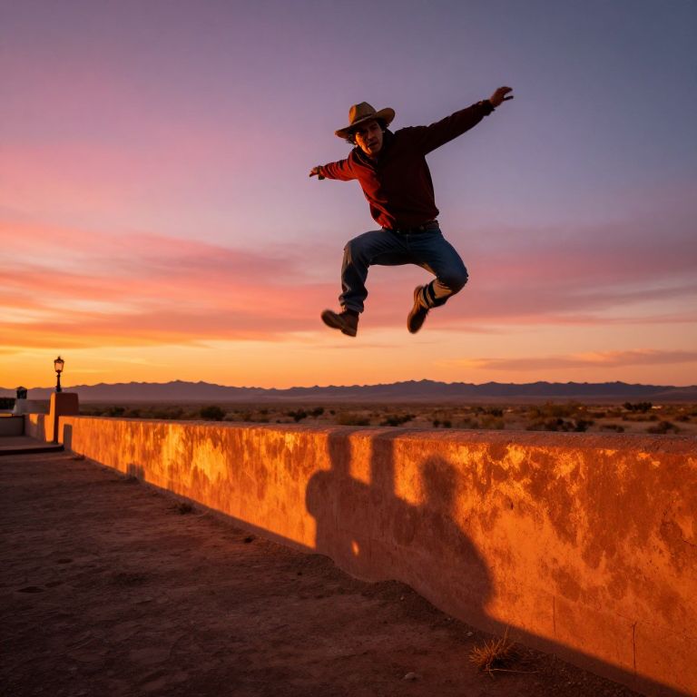 Mexican jumping over the border wall at sunset, dynamic motion, vibrant colors, detailed desert landscape, cinematic style, dramatic shadows, intense expression, realism