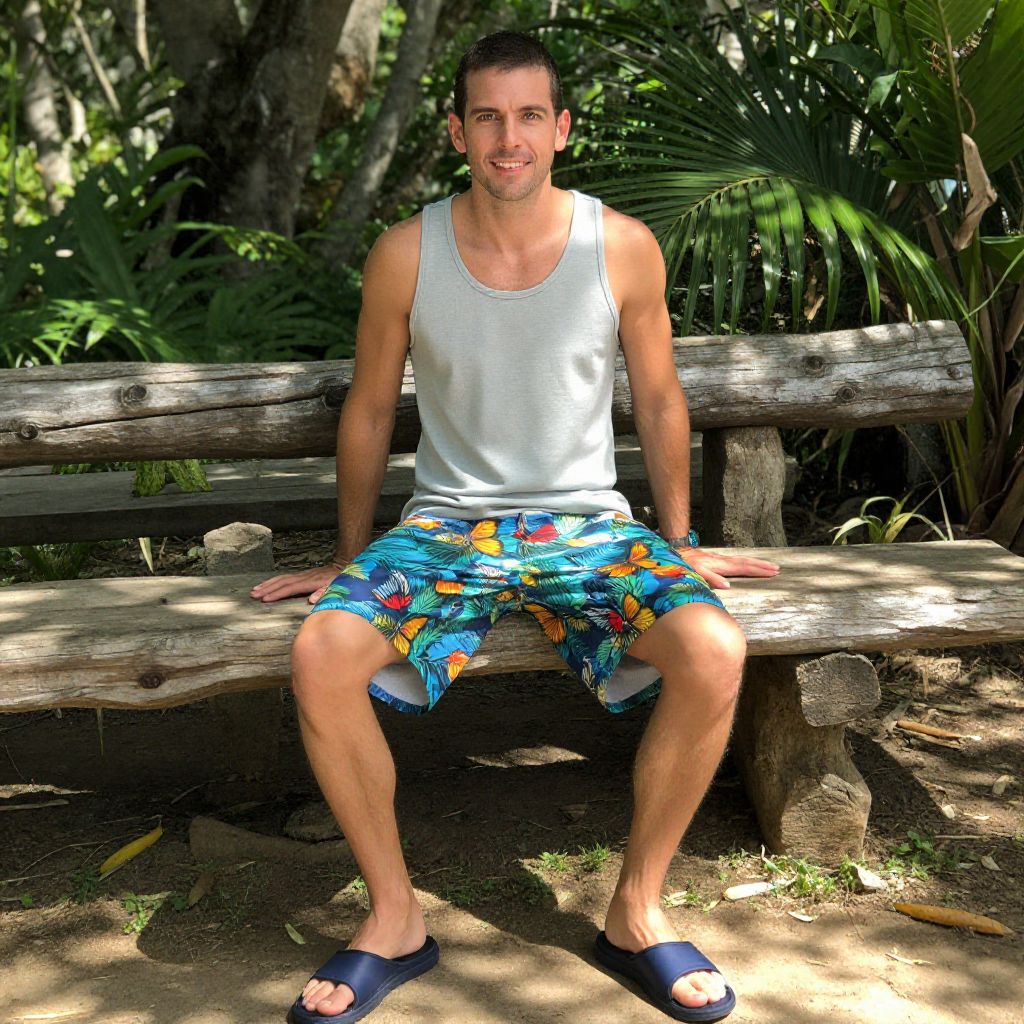 Photograph of a smiling, muscular man with short brown hair, wearing a white tank top, colorful floral shorts, and black sandals, sitting on a
