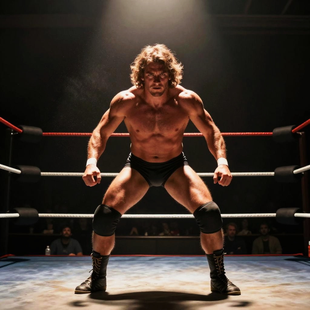 Photograph of two muscular, shirtless male wrestlers in black shiny trunks and boots, one kneeling, the other standing, in a graffiti-covered ring