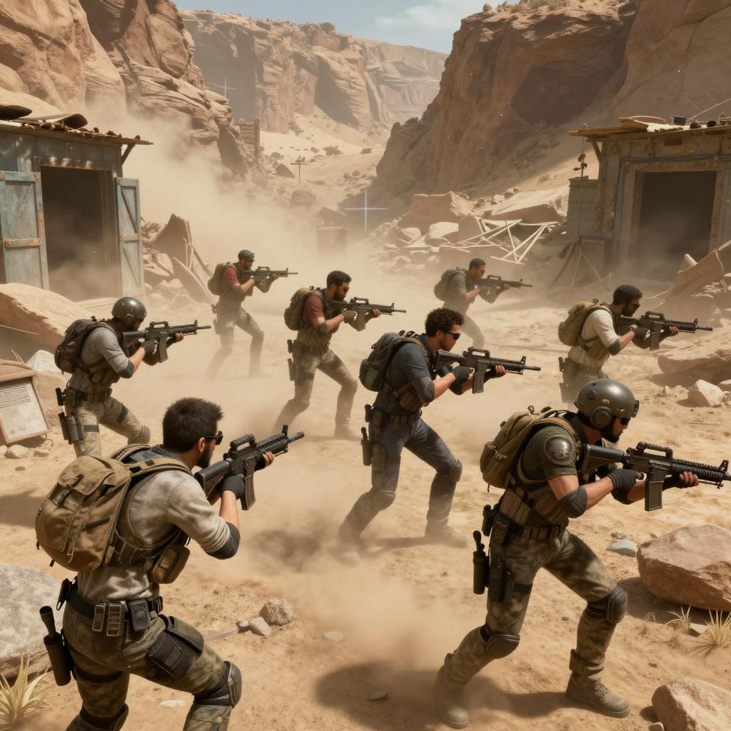 Hyper-realistic image of a mixed-gender, ethnically diverse tactical squad conducting a raid inside a hostile rocky desert canyon compound. The scene features detailed modern armor and weapons, dust clouds, scattered ruins, and a dynamic composition with cinematic lighting, resembling a key art for a military action game.