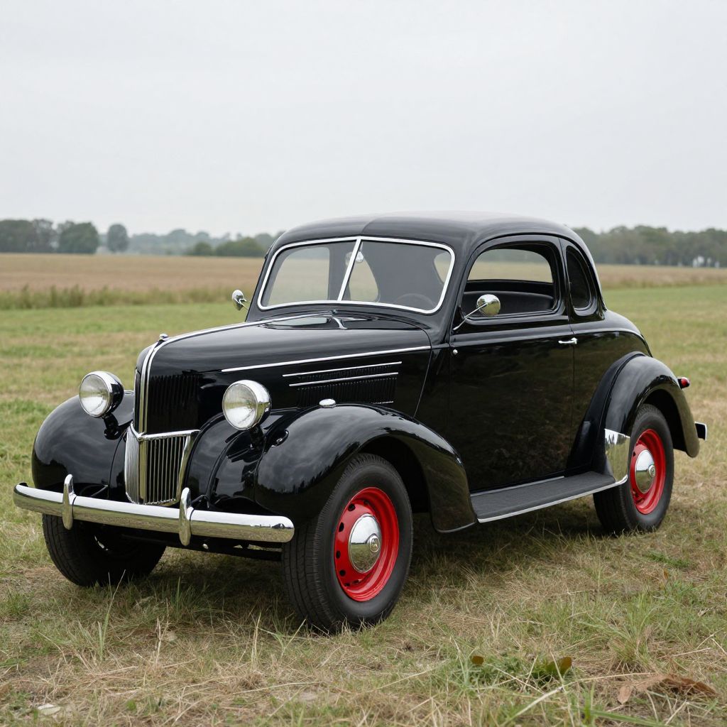 Photograph of a vintage, black, classic car with a glossy finish, parked on a grassy field. The car features round headlights, a chrome grille, and red wheels with chrome hubcaps. The windows are clear, showing a simple, dark interior. The background includes a flat, open field with a distant treeline under an overcast sky. The car's sleek, curved design and polished surface reflect light, emphasizing its elegant, retro style. The overall scene exudes a nostalgic, timeless charm.