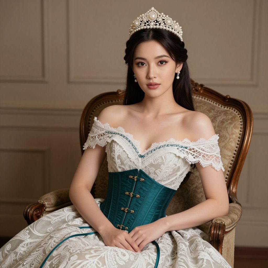 Elegant portrait of a woman adorned with a pearl tiara, seated gracefully in a richly upholstered chair, wearing an off-the-shoulder gown with intricate lace detailing and a teal corset cinched by gold buckles.