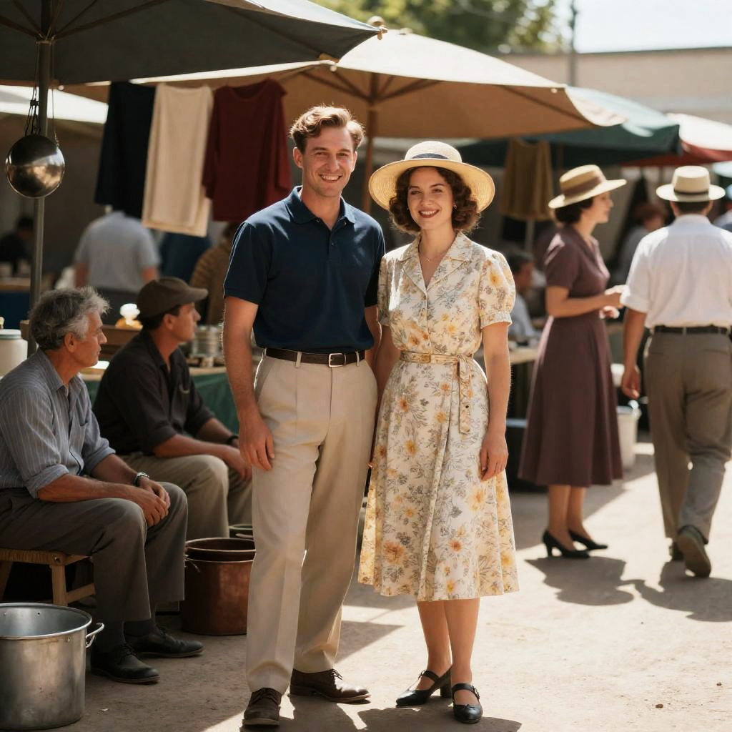 Photograph of two people in a vintage train's interior. Woman in black double-breasted coat with white lace collar, short brown hair, standing, looking forward. Man with messy brown hair, wearing blue jacket, white shirt, colorful skirt, bending over counter, holding papers. Reflections on train windows. Shelves with boxes in background. Warm light from left.
