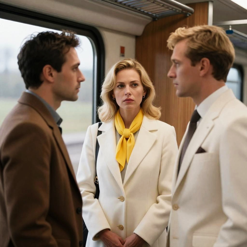 A young woman wearing a black double-breasted coat with a white lace collar stands at a metal counter inside a vintage train car. A man with messy brown hair, dressed in a blue jacket, white shirt, and colorful striped skirt, is bent over the counter examining papers. The train interior features large windows with reflections and overhead shelves holding boxes. Warm natural light enters from the left side.
