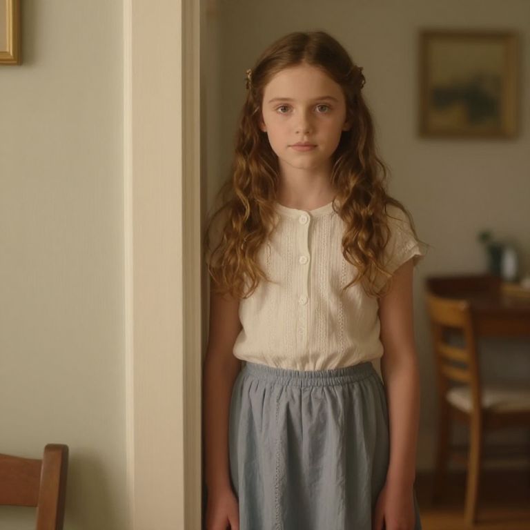 Photograph of a young Caucasian girl with long, wavy brown hair adorned with small hair clips, standing in a doorway. She has a fair complexion and a serious expression. She wears a white, short-sleeved, button-up blouse and a high-waisted, light blue, pleated skirt. The background shows a softly lit, modestly decorated room with a wooden chair and table, and a blurred framed picture on the wall. The image has a warm, natural light, creating a calm and introspective atmosphere.
