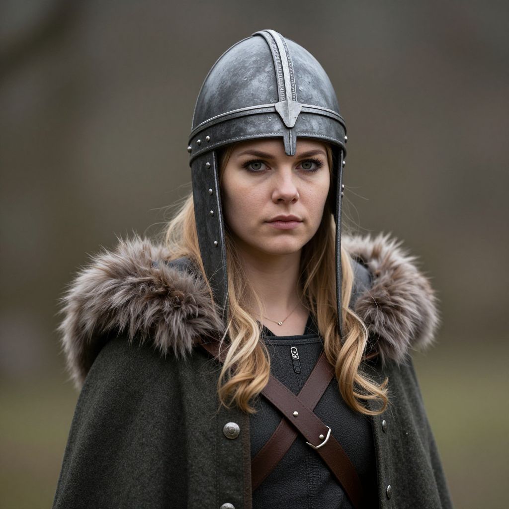 Photograph of a young woman with fair skin and long blonde hair, wearing a medieval-style silver steel helmet with a nasal guard, black leather straps, and a dark green cloak with a fur-lined hood. Her serious expression is highlighted by her dark, intense eyes. She has a black, textured top underneath the cloak, with brown leather straps crossing her chest. The background is blurred, featuring muted, earthy tones of a forest with tall, indistinct trees. The image has a realistic, cinematic quality, suggesting a fantasy or historical setting.