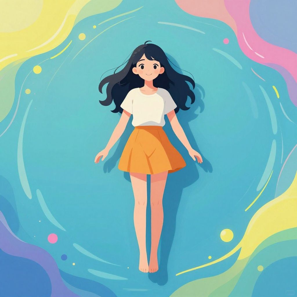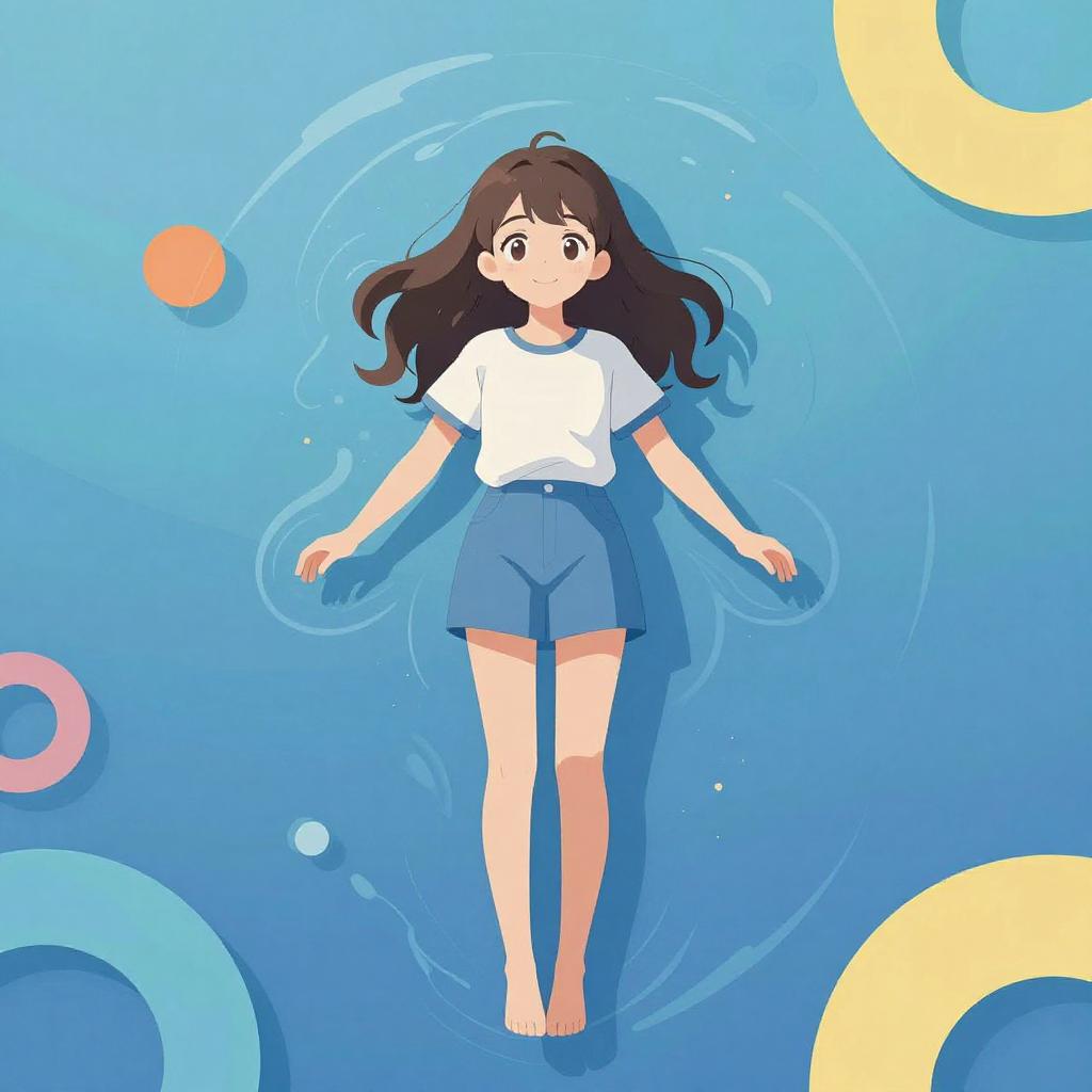 Digital illustration of an Asian woman with closed eyes, dark hair, and pink swimsuit, floating in vibrant blue water with pink and orange lotus flowers