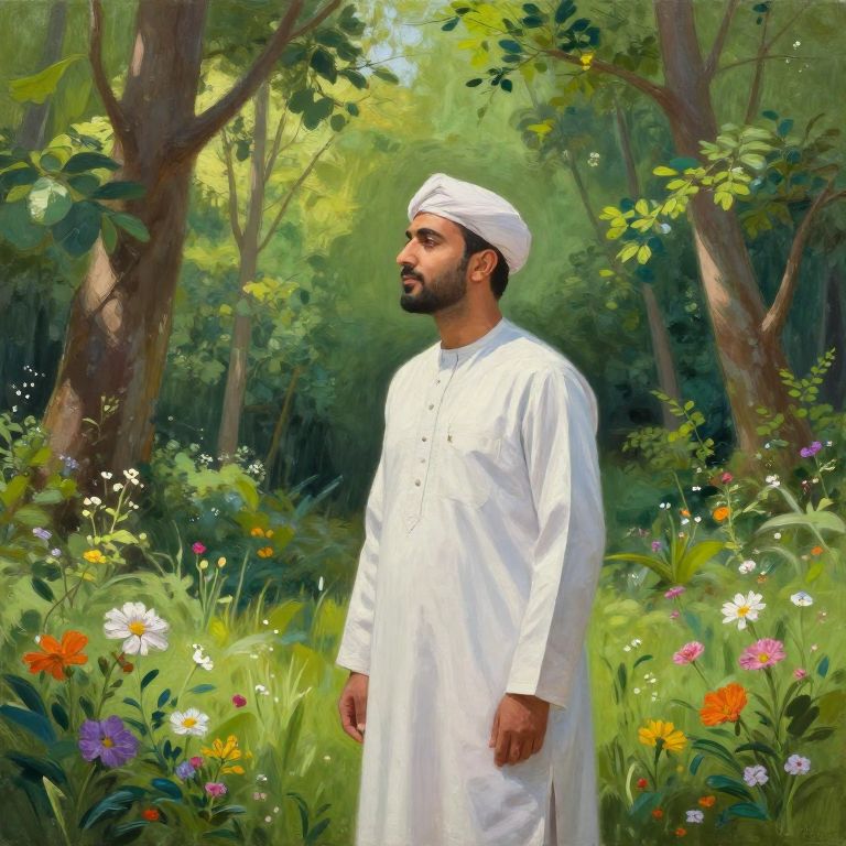 Shawkat in a serene natural environment, surrounded by lush green forests and blooming flowers, gentle sunlight filtering through the trees, peaceful and calming mood, richly detailed and vibrant colors, realistic painting style with soft textures.