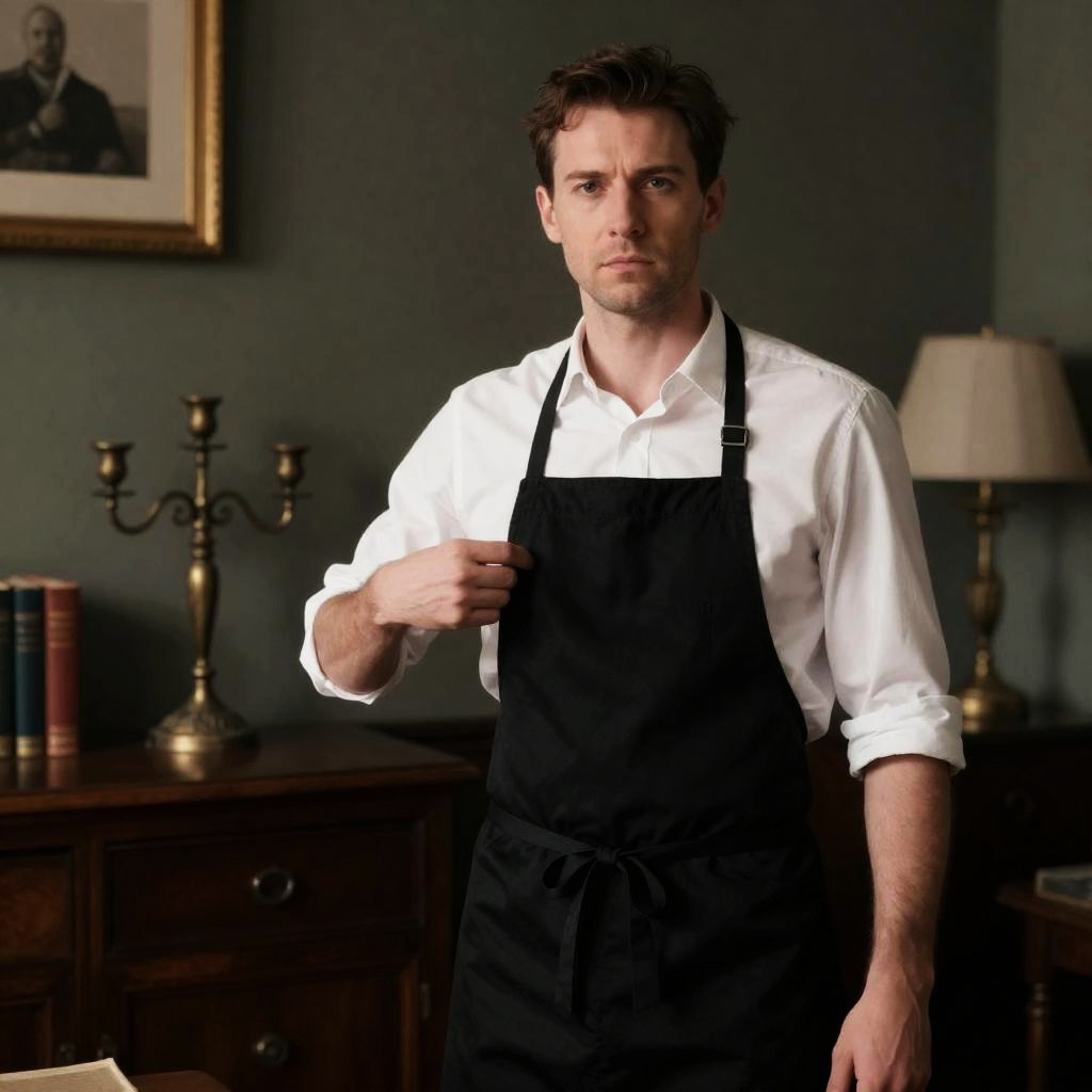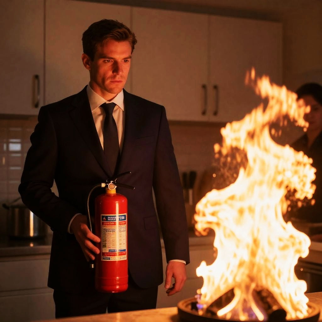Photograph of a man in a dark suit and tie, holding a red fire extinguisher, standing in a dimly lit kitchen with a large, bright flame on the right. Beige cabinets in background. Man has short hair, focused expression. Flame emits intense yellow and orange light. 2 people.
