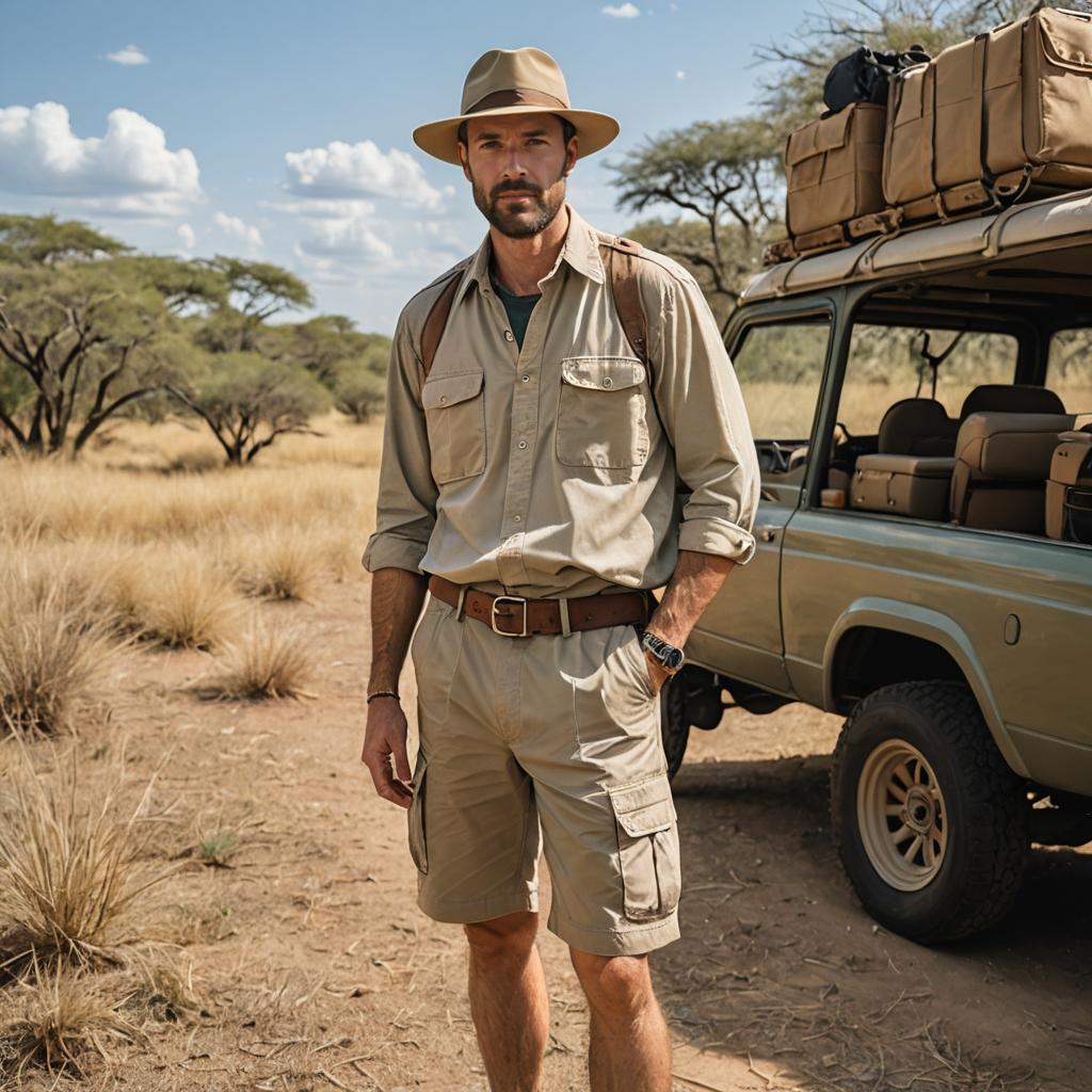 Photo of a Rugged Build man, Pompadour, safari outfit, khaki long-sleeve in Khaki, cargo shorts in Cotton-polyester blend, wide-brim hat, leather loafers, utility belt, adventure-ready, open savannah, international kubism