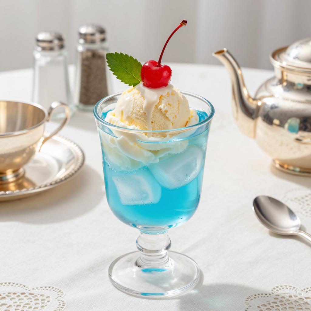 Glass cup with blue drink, ice cubes, vanilla ice cream scoop, cherry with green leaf on top. On white lace tablecloth, silver tea set, glass salt and pepper shakers, blurred background. Bright sunlight, reflective surfaces.