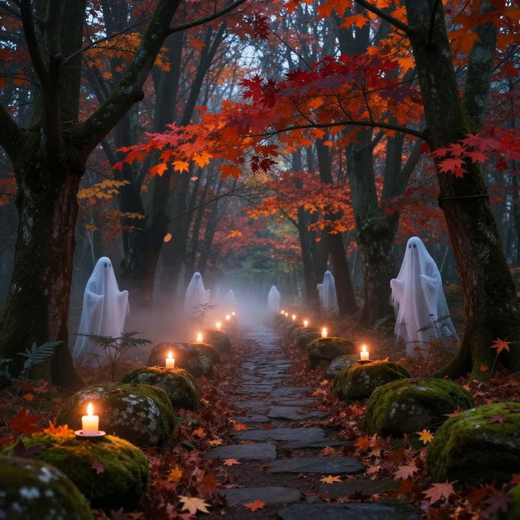 Samhain inspired enchanted forest pathway, trees with autumn leaves turning fiery red and orange, ghostly figures faintly visible, flickering candlelight along the path, mist rolling over moss-covered stones, an atmospheric and mystical vibe evoking ancient folklore