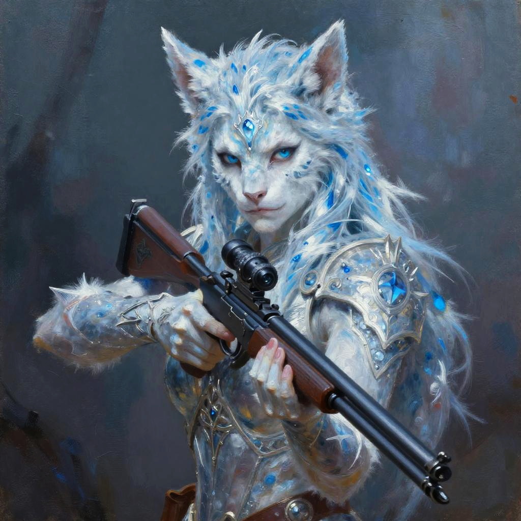 Frostborn Huntress (Ice Lynx), Mythic Realism, D&D character portrait, Stealth marksman portrait, fantasy art, oil painting, Silent intensity