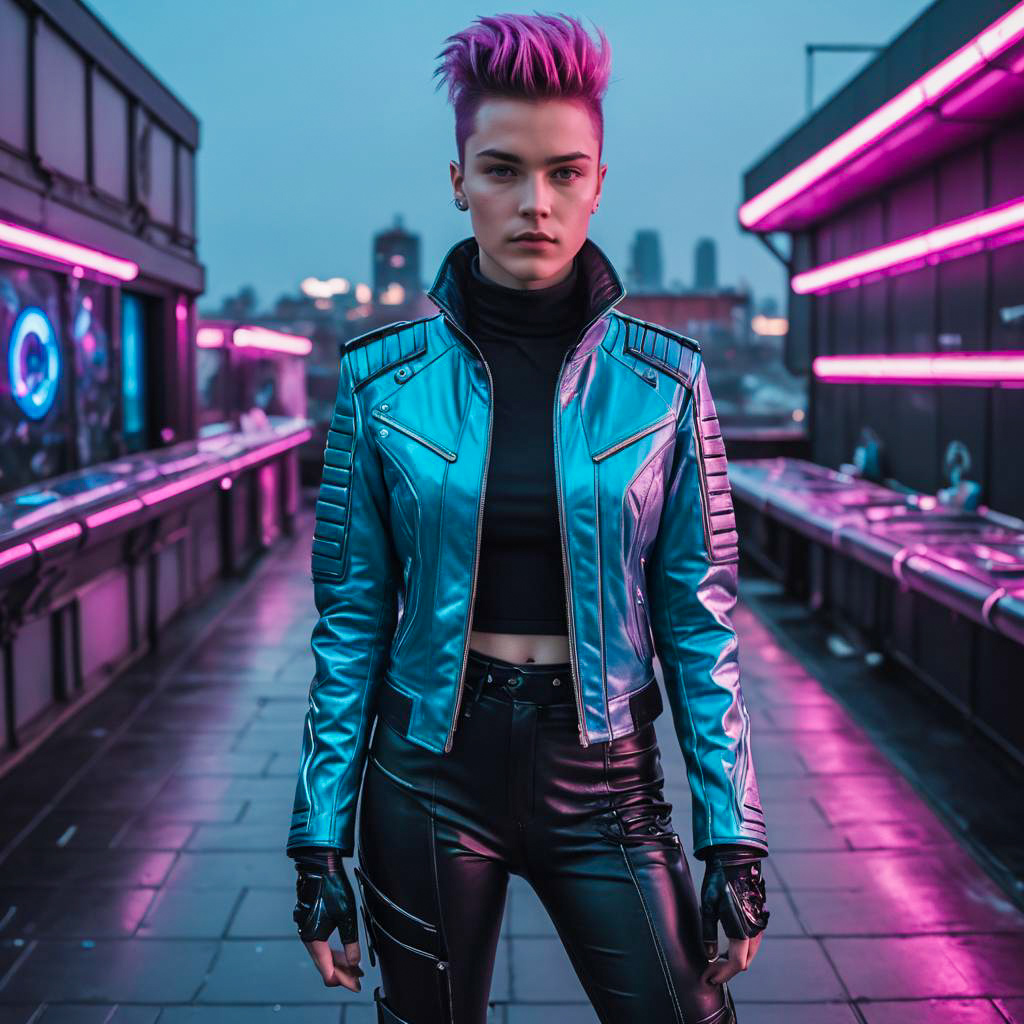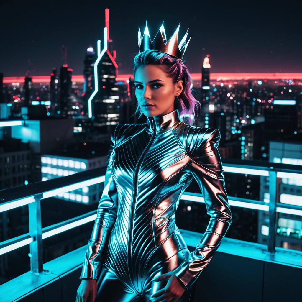 Cybernetic warrior, posed in a neon-lit rooftop garden in a futuristic metropolis, wearing a tailored silver jumpsuit with neon piping and chrome accessories, photorealistic with warm volumetric lighting softly illuminating her flawless skin, captured with a Hasselblad 100 mm f/2.0 at f/4 ISO 200 1/60 s in the style of Gregory Crewdson.
