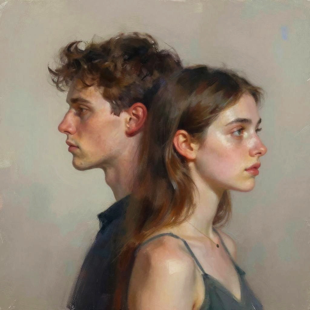 Portraits of pale people with black hair in a surreal dreamscape, floating elements, soft pastel background, delicate expressions, painterly brushwork, fantasy theme