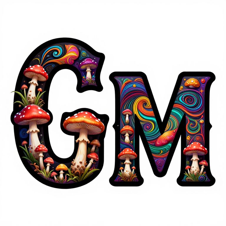 Incomparable logo of the letters G + M, psyachdelics and mushrooms embedded between letter G + M, high-sharpness, hyperrealistic, shot on cannon 50 mm f/1.2, 4k,