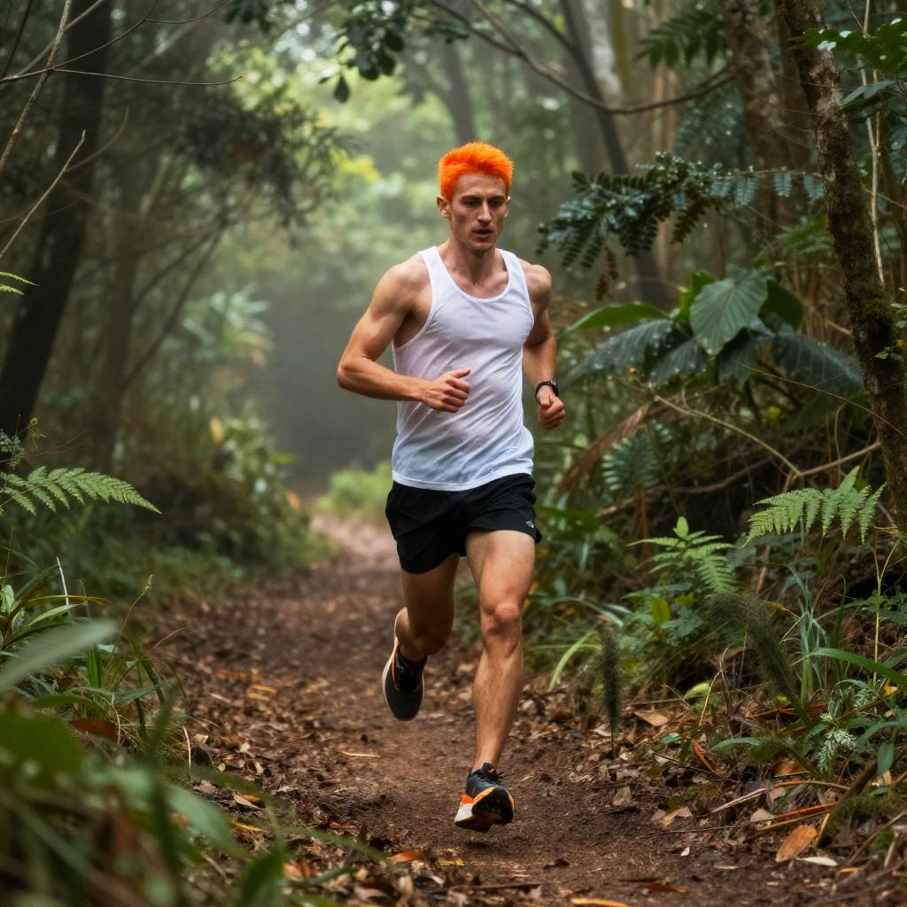 Photograph of a muscular, fair-skinned man with bright orange hair running on a forest trail. He's wearing a white tank top, black shorts, and running shoes with orange accents. The sunlight filters through the dense, green foliage, creating a misty atmosphere. He's mid-stride, looking focused with a determined expression. The dirt path is surrounded by lush plants and tall trees.