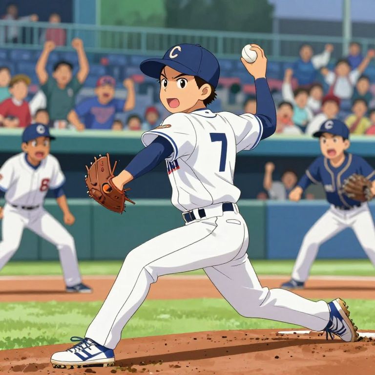 Baseball anime scene featuring a dynamic pitcher throwing a fastball with intense concentration, vibrant stadium background, energetic teammates cheering, colorful and detailed art style with exaggerated expressions and motion blur to emphasize speed and action.