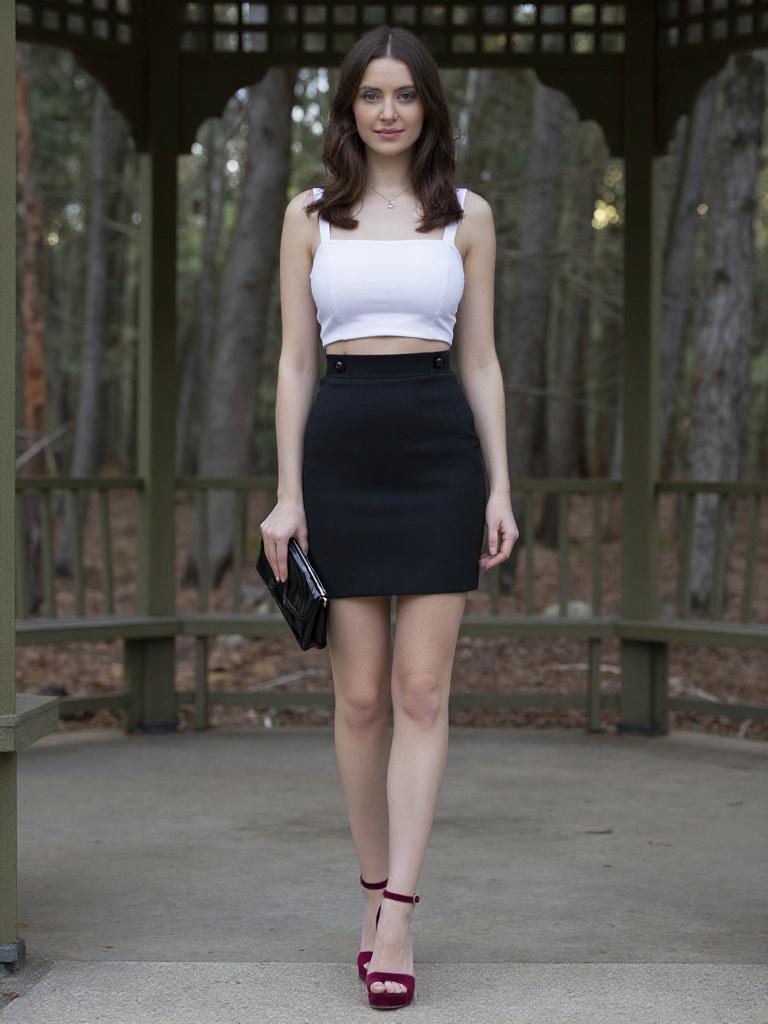 A Slim woman, in a chic white crop top and high-waisted black skirt, stands gracefully under a gazebo in a forest clearing, embodying the vibrant visual style of Audrey Flack. She pairs her look with burgundy ankle strap heels and a glossy black clutch. Sexy. Pretty face and beаutiful eyes. Big breasts