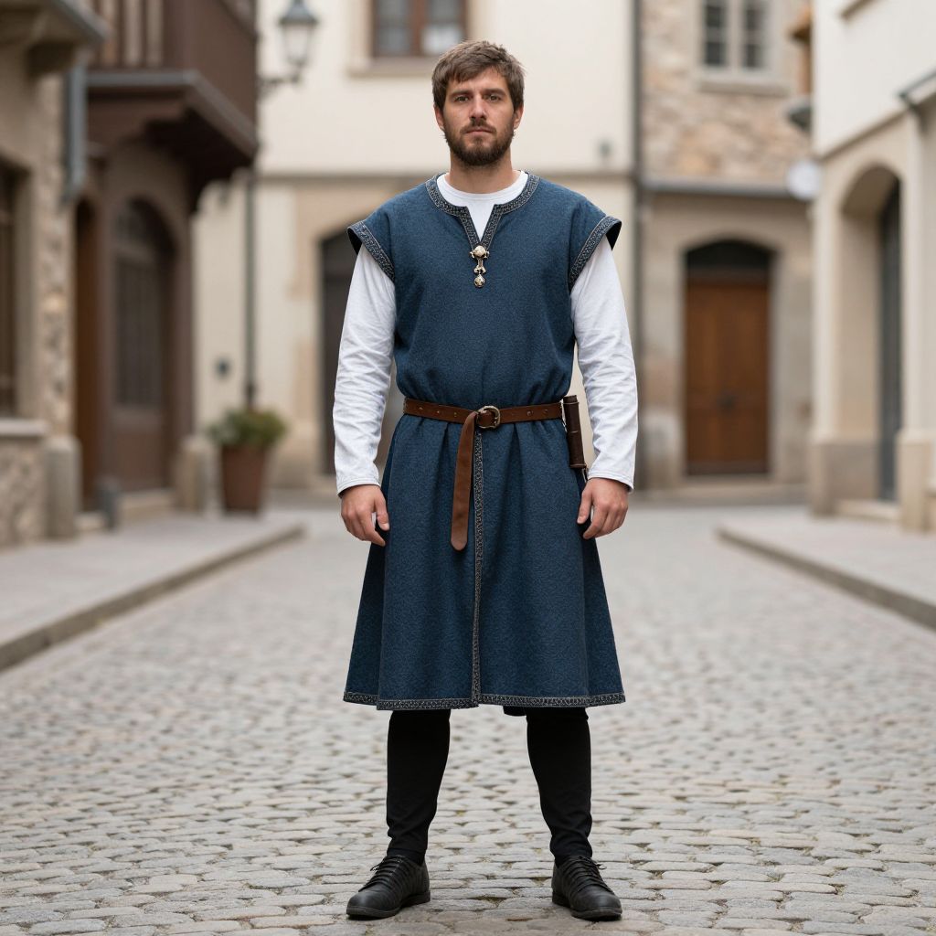 Photograph of a bearded white man with brown hair standing on a cobblestone street in a medieval village. He wears a dark blue, sleeveless, knee-length dress over a white long-sleeve shirt, black pants, and black boots. A brown belt with a buckle cinches his dress. He has a serious expression and stands with his hands relaxed by his sides. The background features blurred, beige stone buildings with wooden doors and windows, and a potted plant on the left. The lighting is natural, and the overall style is historical and rustic.