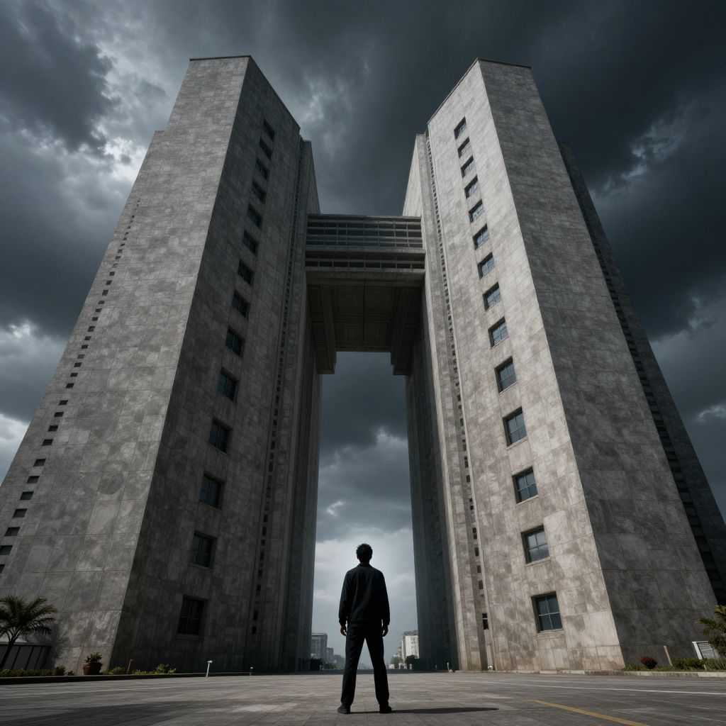 Fear of massive objects depicted as a lone figure facing an enormous looming structure, dark stormy sky, surreal atmosphere, sense of overwhelming scale and tension, dramatic lighting highlighting the stark contrast between human and colossal form, cinematic perspective