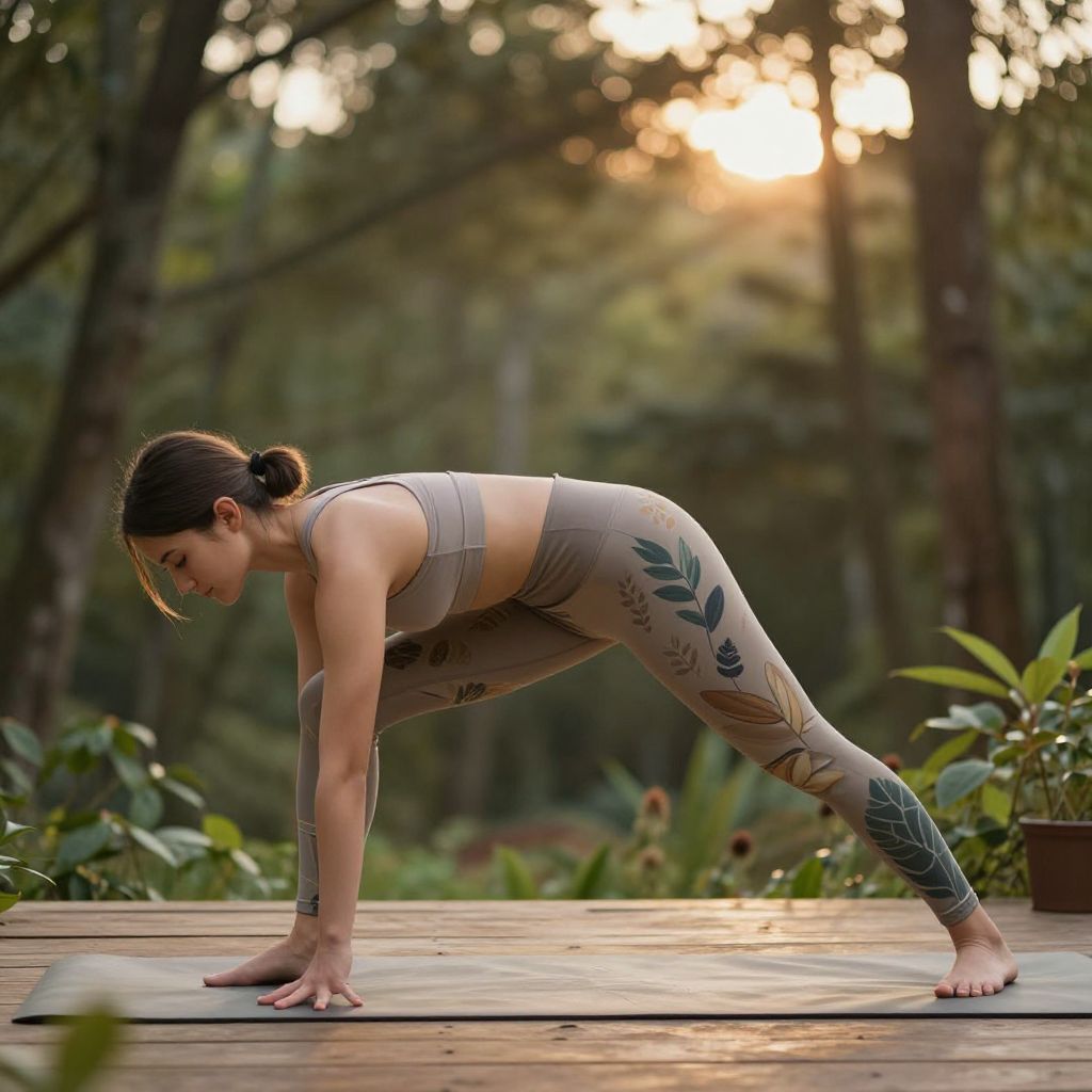 Solo leggings designed with eco-friendly material, earthy tones and leaf motifs, showcased in an outdoor forest environment during golden hour, a young woman doing yoga on a wooden deck, serene and harmonious vibe, highly detailed digital painting.