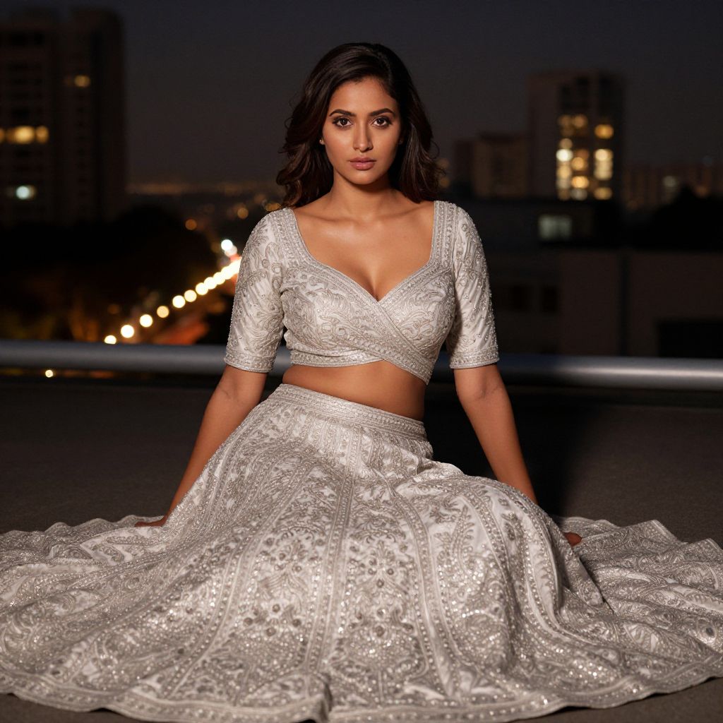A modern fusion lehenga blouse with silver embroidery and asymmetrical cut, worn by a stylish woman with dark brown skin, almond-shaped eyes, and a sharp yet feminine face, sitting on a rooftop in Mumbai during evening, with city lights reflecting in the background, the costume blending traditional and contemporary fashion trends.. The woman has big breasts and cute face