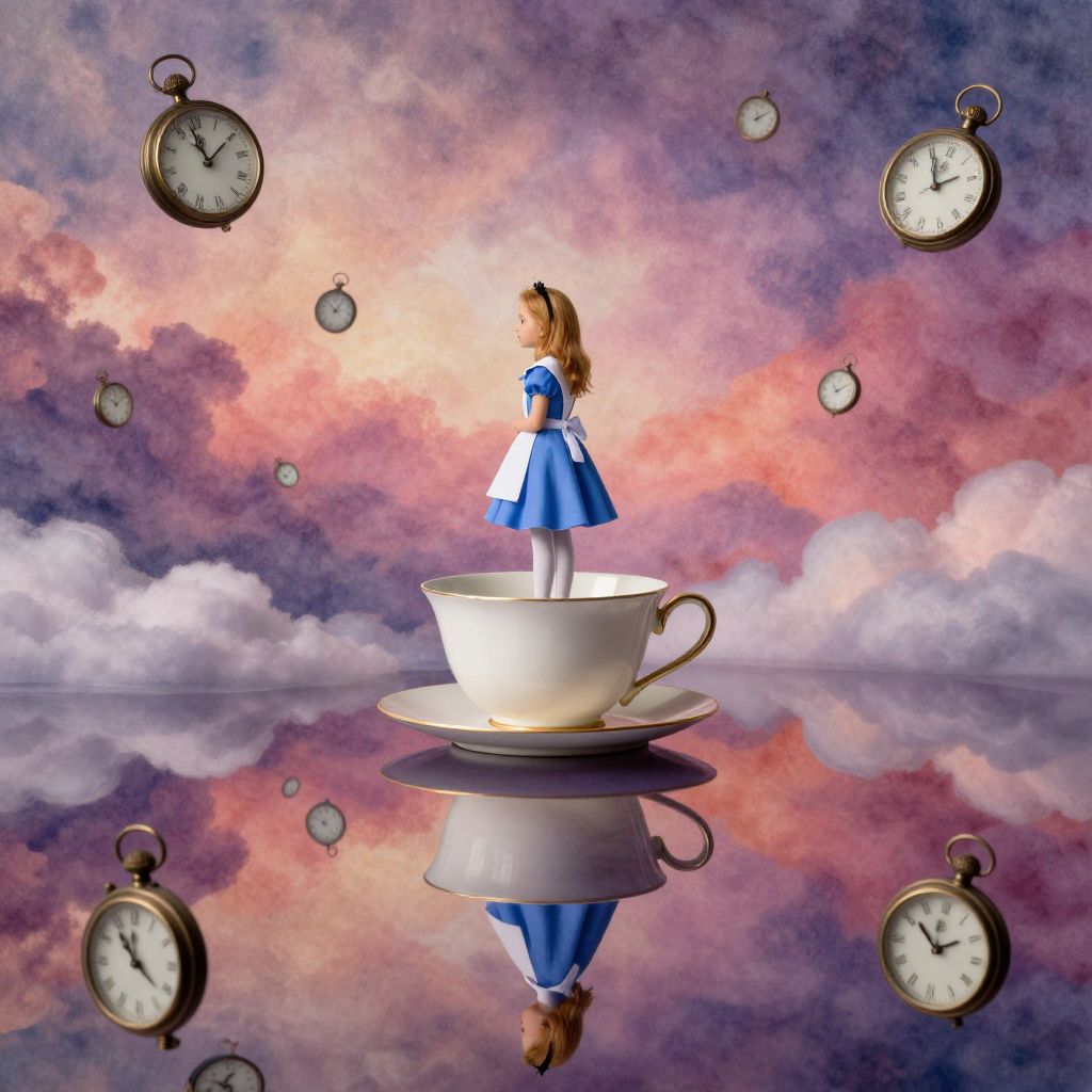 A whimsical yet haunting scene unfolds through an unconventional viewpoint, capturing the enigmatic essence of Carroll's Wonderland fused with Magritte-inspired dreamlike surrealism. Here, the ground dissolves into expansive watercolor skies filled with floating timepieces, reminiscent of a surrealist seascape as Alice stands on an oversized tea cup adrift amongst the clouds. Her serene contemplation contrasts with the absurdity of her surroundings, reflecting infinitely in the polished surface, evoking both childlike wonder and adult bewilderment in a powerful emotional gradient between enchantment and perplexion.