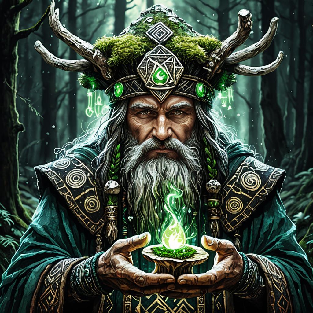 Ultra-photorealistic digital artwork of an ancient druid in a dark forest, holding a glowing green mushroom potion. The druid wears an intricate headdress decorated with moss, antlers, and green gemstones, along with robes adorned with ancient runes and spiral symbols. His long gray beard and intense gaze emphasize a mystical and powerful presence. The image captures detailed textures with hyper-detailed line art and dark fantasy aesthetics.