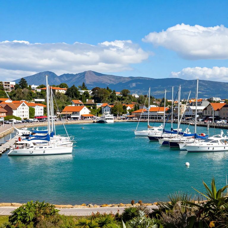 Santander bay panorama with sailing boats and yachts, vibrant marina area, clear turquoise water, distant mountains and forests, bright sunny day with scattered clouds, ultra-realistic digital art with detailed textures