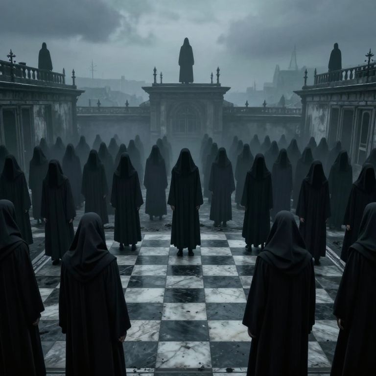 Photograph of a gothic, foggy courtyard with a dark, moody atmosphere. A large group of silhouetted figures, dressed in long, black, hooded robes, stands on a checkered black and white marble floor. The figures face a central, shadowy statue on a pedestal, surrounded by ornate, classical architecture with crosses on the rooflines. The sky is overcast, adding to the eerie, somber mood. The scene evokes a sense of mystery and ritual, with the dense fog obscuring the distant background.