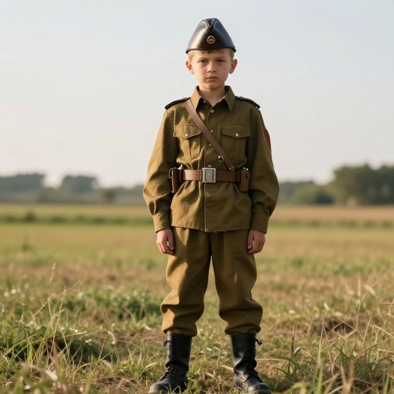 A man in a green military uniform stands confidently on a well-maintained path bordered by tall grass and trees. He wears a green military cap with a slight fold, a full green uniform with subtle insignia on the shoulders, and black leather boots that match the terrain. His face is stern yet focused, with a sharp jawline and a calm expression, as he holds a standard-issue rifle in his right hand, the barrel slightly angled toward the horizon. The setting is a quiet, sun-dappled outdoor landscape during early morning light, with soft golden rays filtering through the trees, creating a realistic and immersive atmosphere.