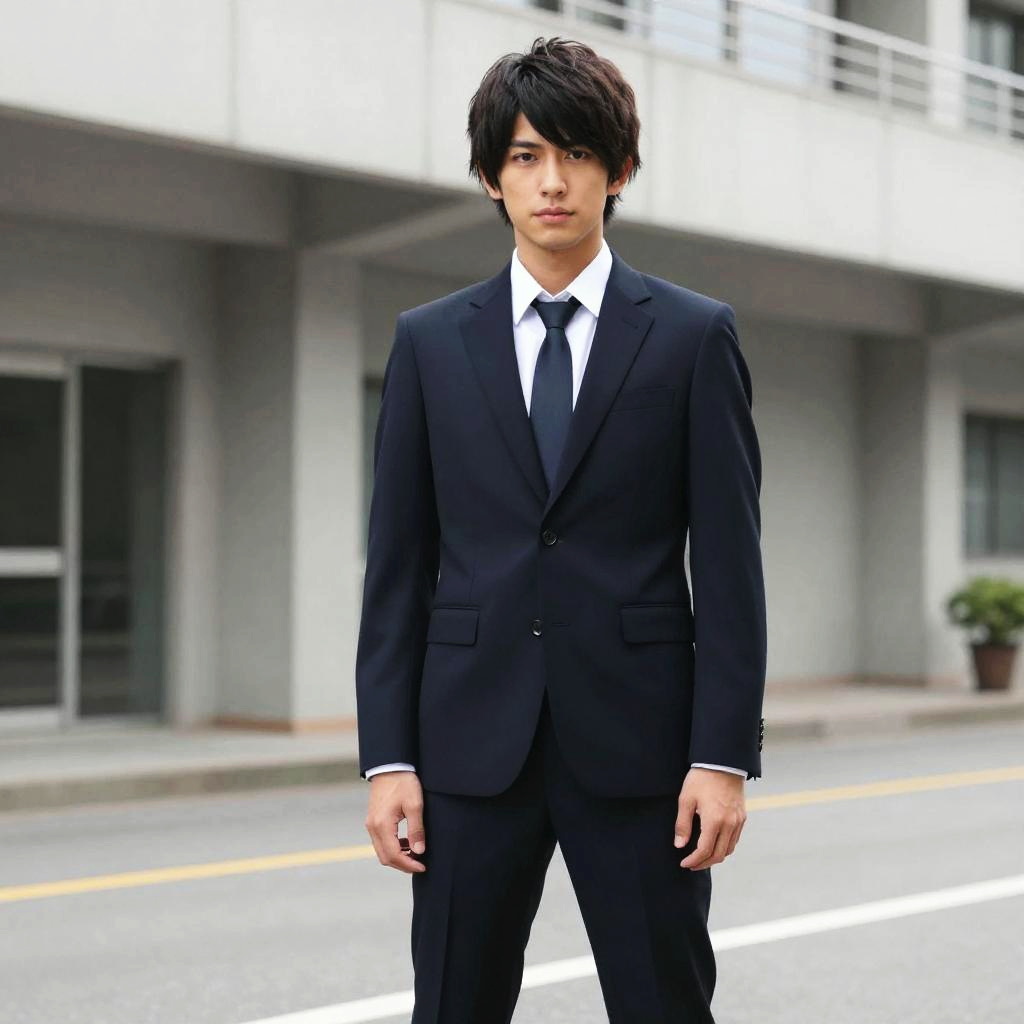 Shouta Aizawa Costume, man in a suit and tie standing in front of a building