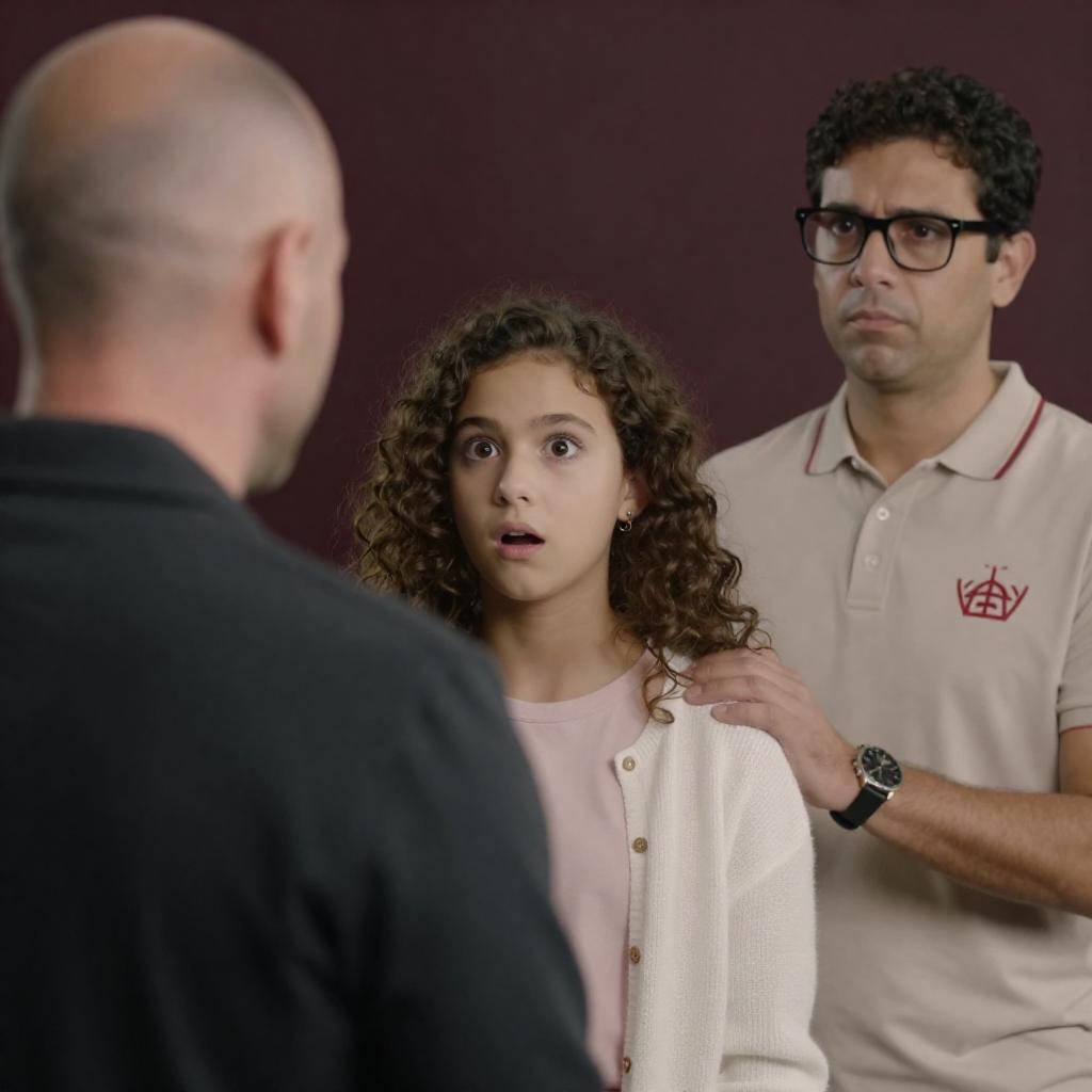Photo of three people engaged in a serious conversation against a dark red background. Foreground shows a bald man in a black shirt with his back to the camera. Middle ground features a young girl with curly brown hair wearing a pink shirt and white cardigan, with a surprised expression. On the right, a man with dark curly hair, black glasses, and a beige polo shirt with a red emblem places a hand supportively on the girl's back, looking serious.