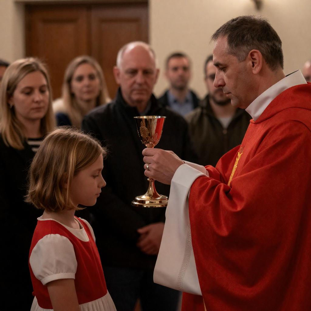 Photograph of a priest with dark hair and a red vestment, holding a chalice, performing a blessing on a young girl with short blonde hair and a red and white dress. Crowd of people in dark clothing surrounds them. Priest's face is focused. Girl's face is turned downward. Several people in the background have neutral expressions. Warm, dim lighting.