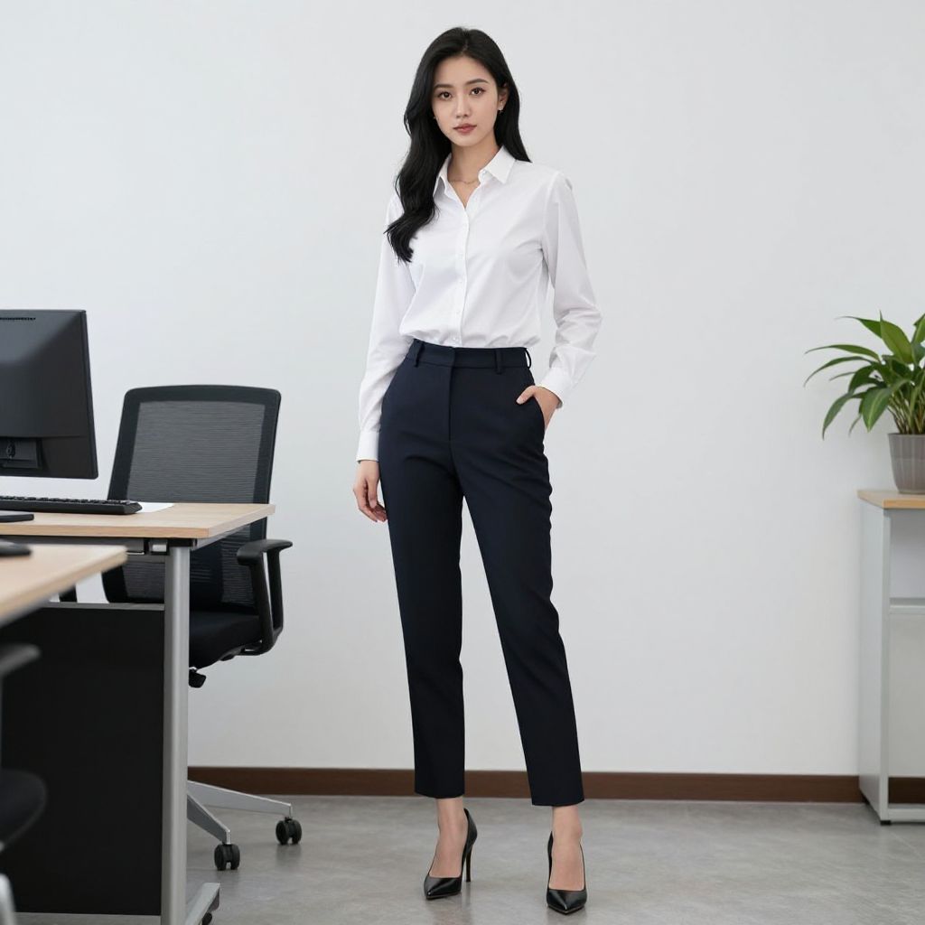 "office chic costume, 1girl, solo, holding bag, pants, necktie, shirt, jacket, white shirt, realistic, hand in pocket, black footwear, bag, holding, black pants, full body, black necktie, hair bun, single hair bun, brown jacket, collared shirt, asian, black hair, standing, looking at viewer, open jacket, open clothes Realistic photo of casual sexy person with pretty face"