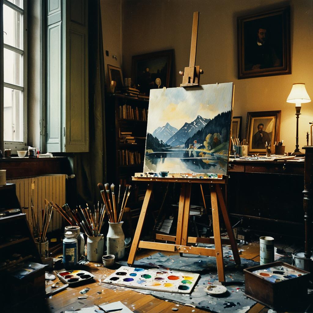 Dimly lit vintage artist studio featuring a small wooden easel with a watercolor painting of a mountain landscape. The room is cluttered with scattered paint tubes, palettes with mixed colors, numerous paintbrushes in jars, and classical wooden furniture. Portrait paintings adorn the walls, enhancing the historical atmosphere. Light filters through a large window in a late evening setting, capturing an authentic early 1900s Austrian artist workspace.