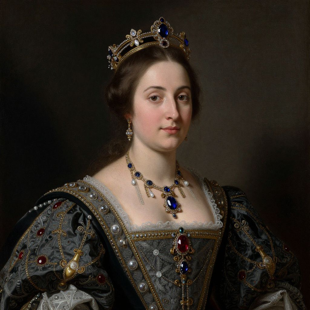 Baroque-style portrait of a fair-skinned, dark-haired queen wearing an ornate gold crown, intricate blue gown, and multiple jeweled necklaces